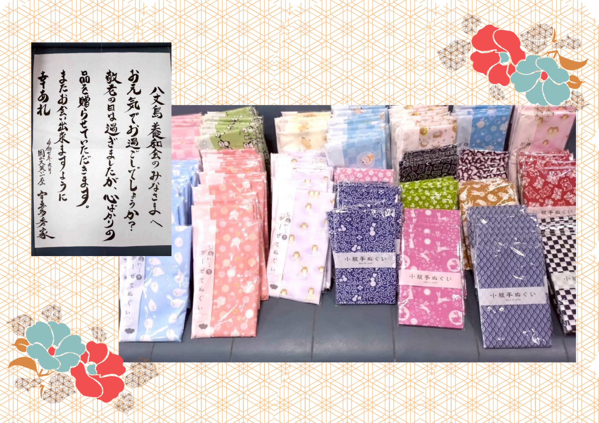 令和7年9月敬老の日など 9月15日敬老の日♪ 昼食に吹き寄せちらし寿司を提供させていただきました。みなさまのご長寿と健康に、心からお祝いを申し上げます✨ 岡山県でご活躍されている宇喜多秀家様より、敬老の日に合わせて、利用者の皆さまにかわいい手ぬぐいをたくさんご寄贈頂きました✨ 優しい手触りと、本当に可愛らしいデザインで、皆さまとても楽しそうに選んでいらっしゃいました♪ 頭にかぶってみたり、首元に巻いてみたり、皆さまとてもお似合いです✨ 本当にありがとうございました✨ 9月のとある日。この日は皆さま年に一度のレントゲン撮影の日でした。 町立病院の駐車場にて、お天気が良かったのでハイビスカスをバックに写真を撮らせていただきました✨ 過ごしやすい気候で、みなさまとても気持ちよさそうでした♪�