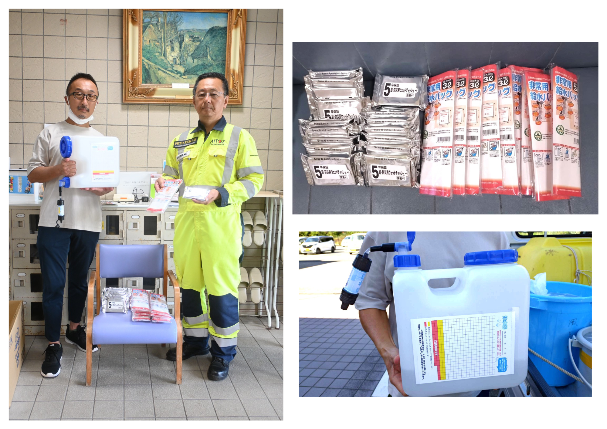 減災・防災クリエーター、防災士の島野孝文さまより、防災ウェットティッシュ、給水バッグ、浄水器をご寄贈いただきました。