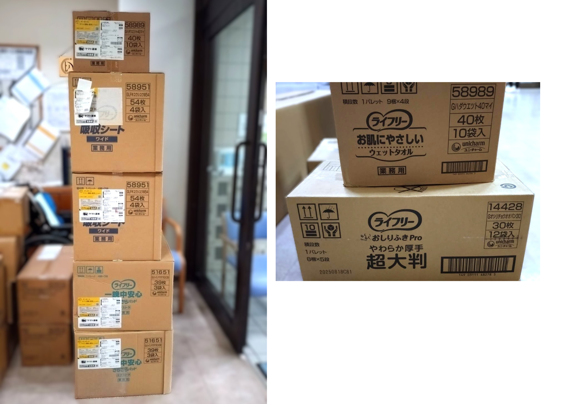 ユニ・チャーム株式会社様より、パッドエクストラ(吸収量1100㏄)、おしりふきPro超大判、個包装 ウェットタオル、吸収シートワイドをご寄贈いただきました。