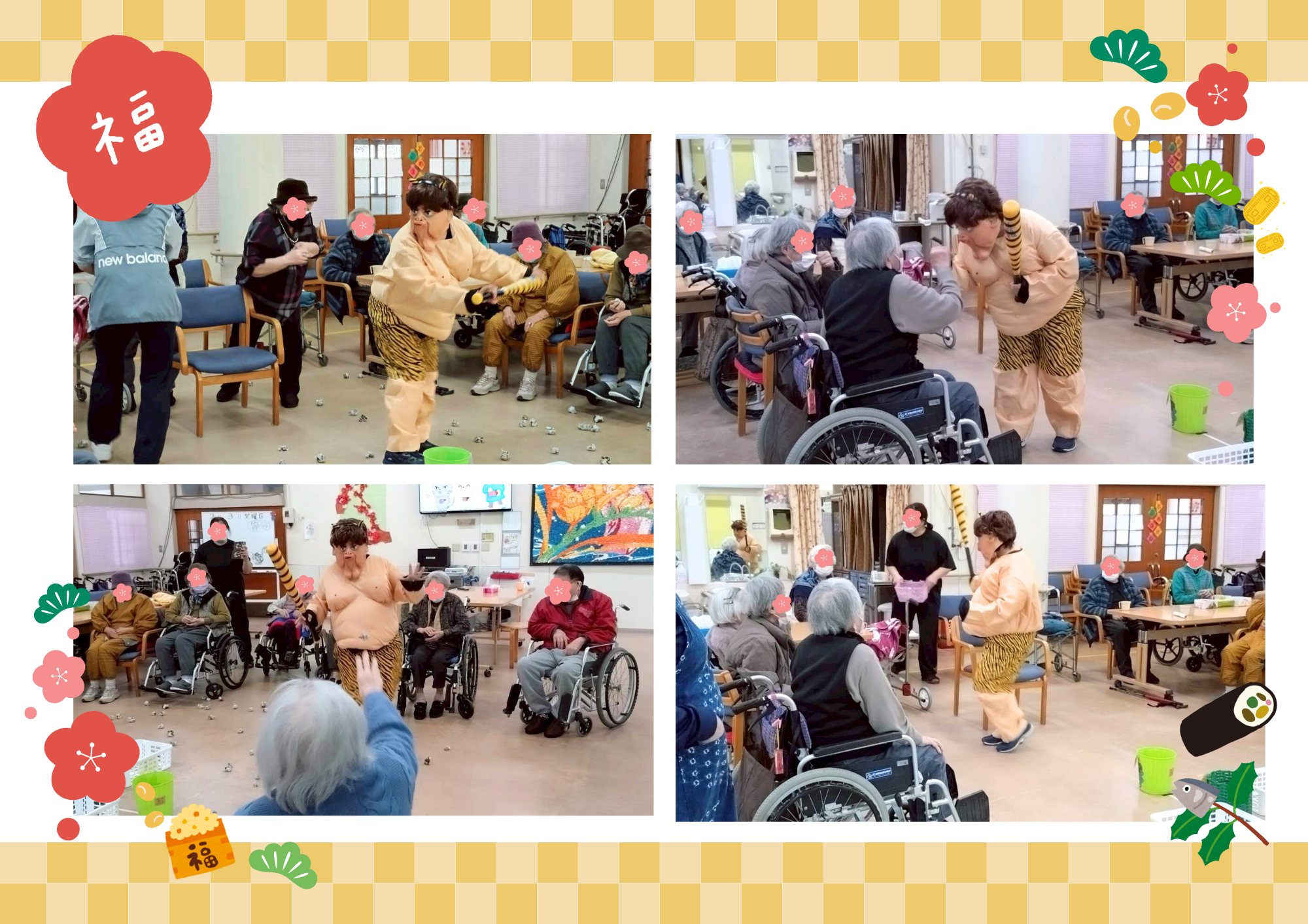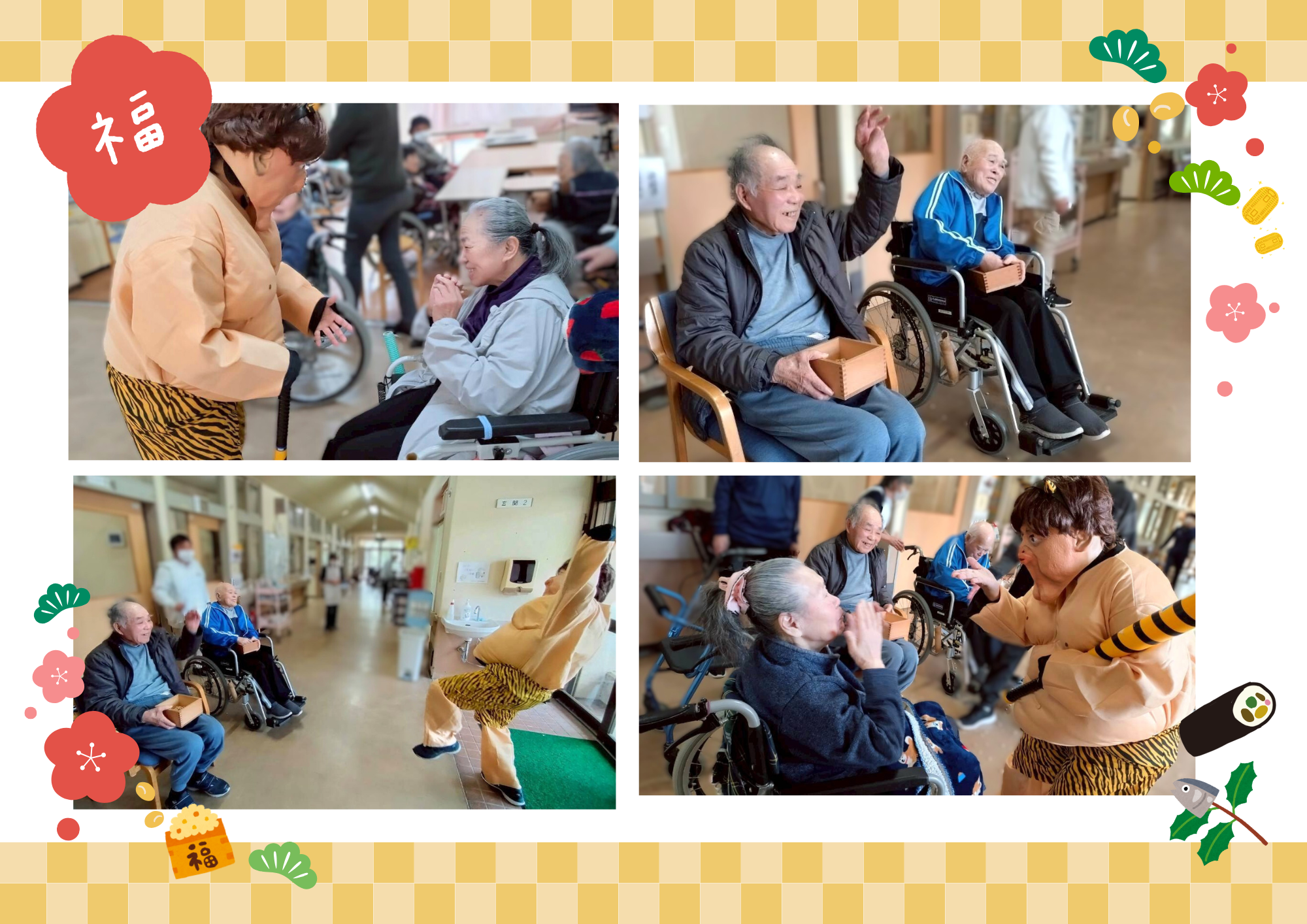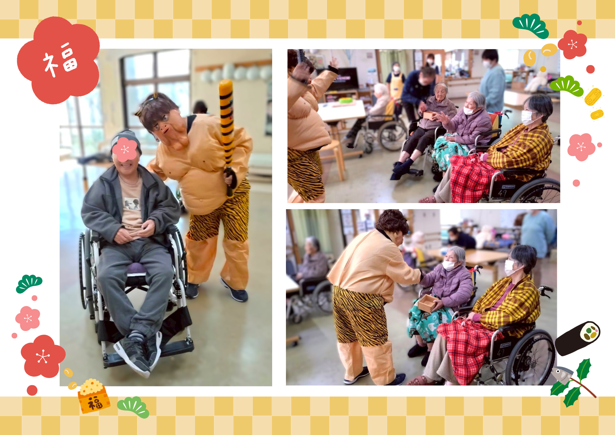 令和8年2月節分など 養和会では節分の日に、特養に入所されている年男・年女の皆さまに豆まきをして頂いています。 今年も陽気な鬼さんが登場し、元気いっぱいに楽しく豆まきをして頂きました♪ デイサービスでは、通所されている利用者の皆さまが、豆に見立てた新聞紙をたくさんまいていらっしゃいました😊 皆さまの無病息災をお祈りします✨ 八丈島三根会の皆さまより「復興応援夢袋」としてお菓子の詰合せをたくさんご寄附いただきました。 ひとつひとつご丁寧に包んであり、復興へのお気持ちが伝わってきました。利用者の皆さまにもとても喜んでいただけました。 八丈島三根会の皆さま、本当にありがとうございました✨